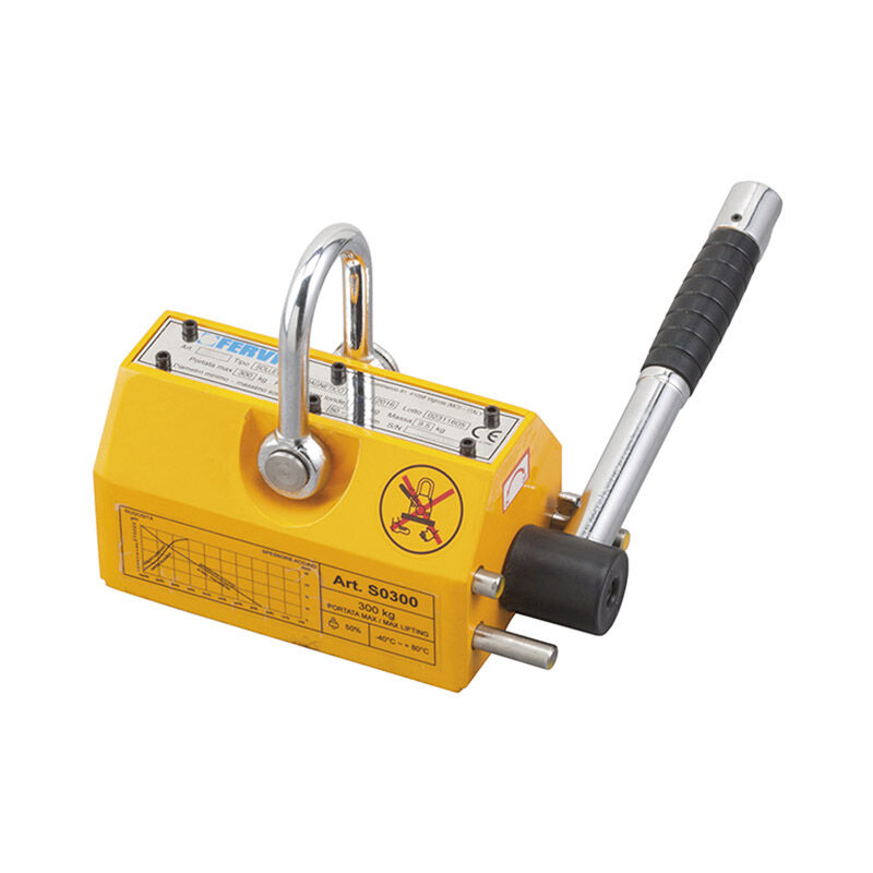 Il sollevatore magnetico FERVI S0300 è un sollevatore magnetico permanente a comando manuale atto alla movimentazione (sollevamento, traslazione e deposito) di materiale ferromagnetico tipo: lamiere, piatti, tondi ecc. di materiale ferroso comune. Il sollevatore sfrutta le proprietà dei magneti permanenti di creare un campo magnetico in grado di attrarre materiali ferrosi. L'attivazione viene eseguita per mezzo di una leva che fa ruotare un nucleo nel quale sono incorporati i magneti permanenti, così da ottenere un flusso magnetico che nella fase di lavoro attraversi il carico da manipolare e nella fase di rilascio si cortocircuiti all'interno del sollevatore stesso. Caratteristiche tecniche del supporto FERVI S0300 Portata max: 300 kg Portata barre tonde: 100 kg Diametro min-max sollevabile: 50 ÷ 300 mm Dimensioni: 189 x 163 x 92 (B) mm Peso netto: 9.5 kg