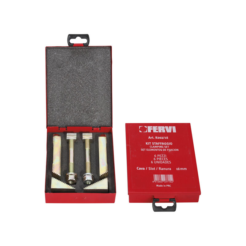 NUOVO KIT DI STAFFAGGIO COMPOSTO DA 6 PZ. PER CAVA A T DA 8 mm. Marca: FERVI Codice: K002/08 SET STAFFAGGIO 6 PZ - CAVA 8 mm, CUNEO DI BLOCCO IN ACCIAIO SINTERIZZATO ZINCATO STAFFE IN ACCIAIO #45 ZINCATO N° 2 CUNEI DI BLOCCO: 25 x 25 x 42 mm N° 2 STAFFE: 100 x 25 x 15 mm N° 2 TIRANTI A T CON DADO: M6 x 100 mm CAVA: 8 mm. SCATOLA IN METALLO: 125 x 154 x 32mm PESO: 1 Kg. GARANZIA 24 MESI !!!