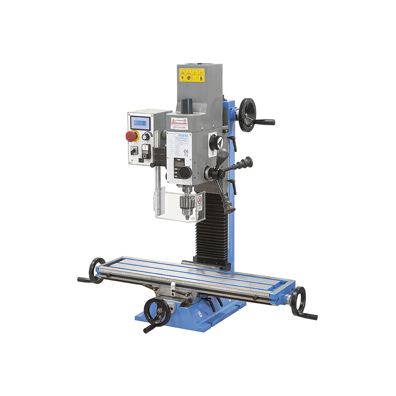 l'alesatura e la lamatura. Le macchine sono realizzate per eseguire tali lavorazioni su materiali differenti, variando l'utensile in funzione delle operazioni da eseguire e del materiale di cui è costituito il pezzo da lavorare. La macchina prevede differenti velocità di rotazione del mandrino. Il motore può girare a due differenti velocità quindi un sistema di controllo elettronico permette di variare la rotazione da 50 rpm a 1400 rpm con rotazione lenta del motore e da 100 rpm a 3000 rpm con rotazione veloce del motore. In corrispondenza della testa sono presenti il selettore e la manopola che permettono di variare la velocità. L'avanzamento dell'utensile (foratura) ed il movimento della tavola (fresatura) sono completamente manuali. Caratteristiche tecniche della fresatrice FERVI T061A Capacità di foratura con
