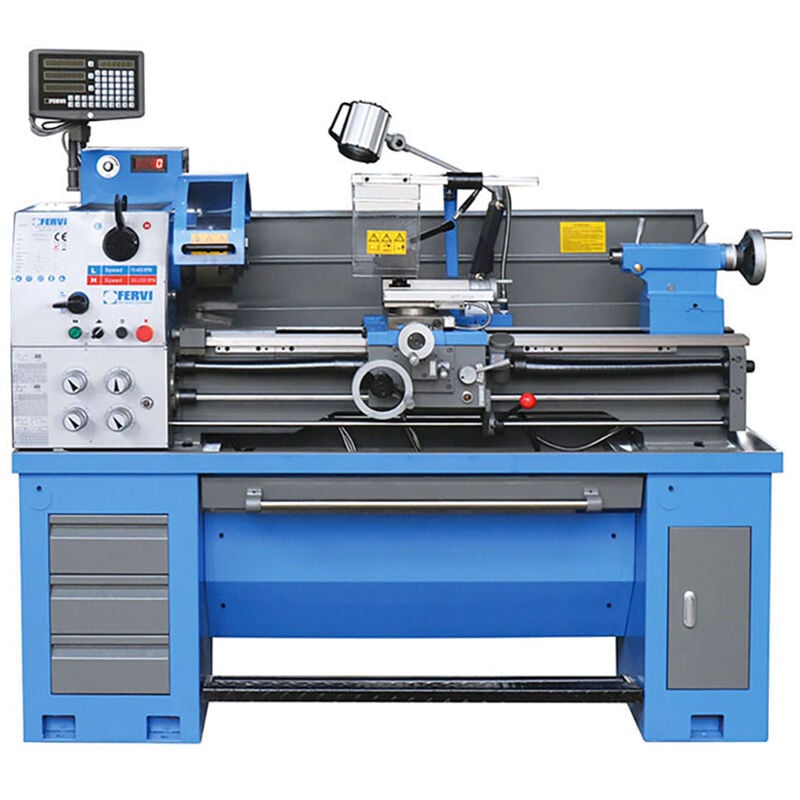 Il tornio parallelo FERVI T069/400VI3A è una macchina utensile professionale che consente di eseguire lavorazioni con estrema precisione su tutti i tipi di materiali metallici e non solo. In particolare, si possono effettuare torniture cilindriche e coniche, sfacciature, profilature, forature, alesature, filettature e troncature . Il tornio 800VPG1048 vanta un motore trifase da 1,5 kW in grado di erogare una potenza elettrica decisamente superiore se confrontata con quella di un modello monofase a parità di caratteristiche tecniche. Tale motore aziona un mandrino autocentrante a 3 griffe reversibili, supportato da due cuscinetti di precisione e progettato per assicurare una presa salda e sicura del pezzo da lavorare;