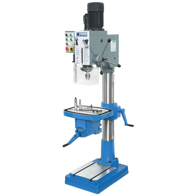 Il trapano a colonna ad ingranaggi FERVI T062 è un articolo che si sta affermando sempre di più non solo in ambito professionale, ma anche tra hobbisti e nel mondo del fai-da-te. Grazie alla verticalizzazione del movimento, consente l'esecuzione della lavorazione con estrema precisione, in tutta sicurezza ed al minimo sforzo. In particolare, si possono compiere lavorazioni di foratura ( capacità massima su acciaio di Ø 35 ), filettatura, alesatura e lamatura su materiali di svariata natura. Il mandrino possiede ben 12 differenti velocità di rotazione, espletate da un motore trifase a due velocità 1,1/1,5 kW accompagnato a un sistema di trasmissione ad ingranaggi per l'ottenimento dei diversi regimi. Lateralmente alla testa della macchina, sono presenti il quadro elettrico, comprensivo di comandi, e le leve che ne comandano la discesa: l'avanzamento dell'utensile può essere manuale o automatico, a seconda delle esigenze di lavorazione. Presente anche la funzione di inversione di