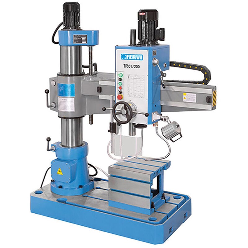 Per l'esecuzione di fori, scanalature e/o asole su pezzi di grandi dimensioni con pesi anche ingenti, FERVI ha messo a punto il trapano radiale TR01/200, che è in grado di eseguire con estrema precisione operazioni meccaniche quali forature, alesature, lamature, maschiature ecc. Il trapano a bandiera FERVI TR01/200 è stato progettato per eseguire tali lavorazioni su materiali differenti (acciaio, ghisa, ecc.), variando l'utensile in funzione delle operazioni da eseguire e del materiale di cui è costituito il pezzo da lavorare. La macchina è comprensiva di impianto di lubrificazione con pompa da 90 W e di impianto d'illuminazione con lampada a LED che consente un'ottimizzazione dei consumi, oltre ad un miglioramento della visibilità durante la lavorazione. Una colonna portante in acciaio sostiene una guida orizzontale motorizzata regolabile in altezza su cui scorre un carrello con la testa e tutti gli organi necessari alle operazioni da svolgere: la discesa automatica del cannotto