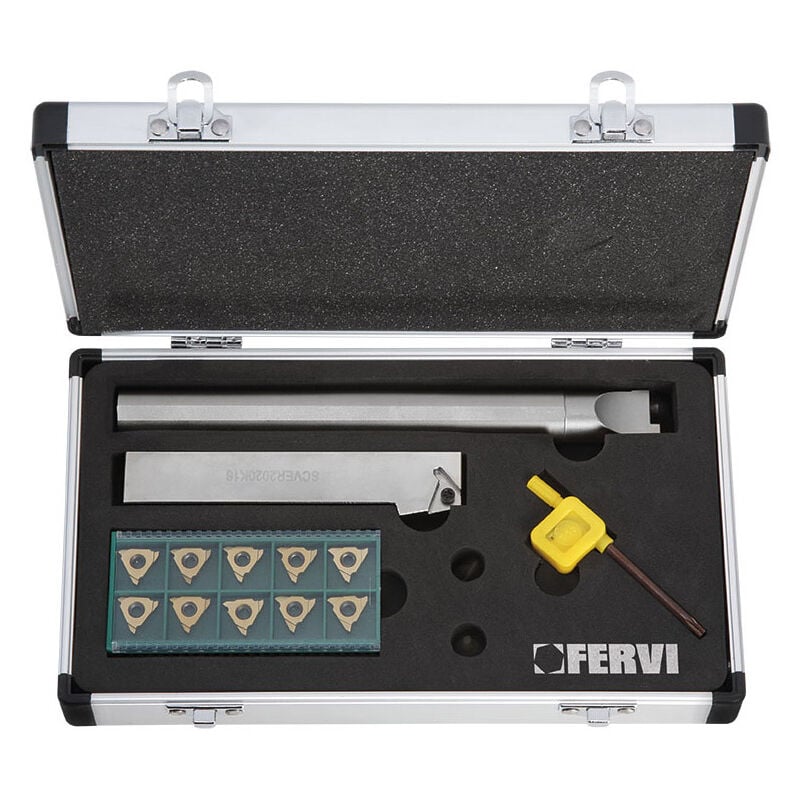 Set per canalini esterni ed intern i FERVI KICAN, utensili altamente professionali per lavorazione su tutti i tipi di materiali . Caratteristiche tecniche del kit utensile tornio FERVI KICAN NR°1 Utensile per canalini esterni stelo 20 x 20 mm K16 NR°1 Utensile per canalini interni stelo Ø 20 mm S16 NR°2 Vite: M4 x 12 mm NR°1 Chiave Torx: T15 NR°10 Inserti per scanalatura 16 mm rivestiti al TIN: spessore 1,1 - 1,3 - 1,6 - 1,85 - 2,15 - 2,65 - 3,15 mm Garanzia di 24 mesi