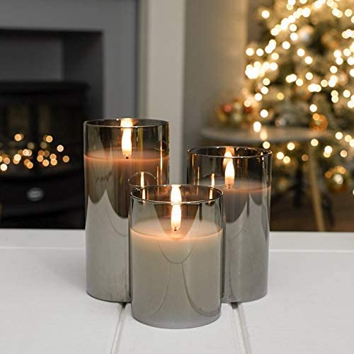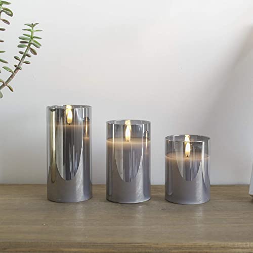 Festive Lights - Candela a LED in vera cera - fiamma incredibilmente vera con effetto stoppino bruciante, funzionamento a batteria - Esclusivo grigio in vetro colorato, confezione da 3 (S/M/L)