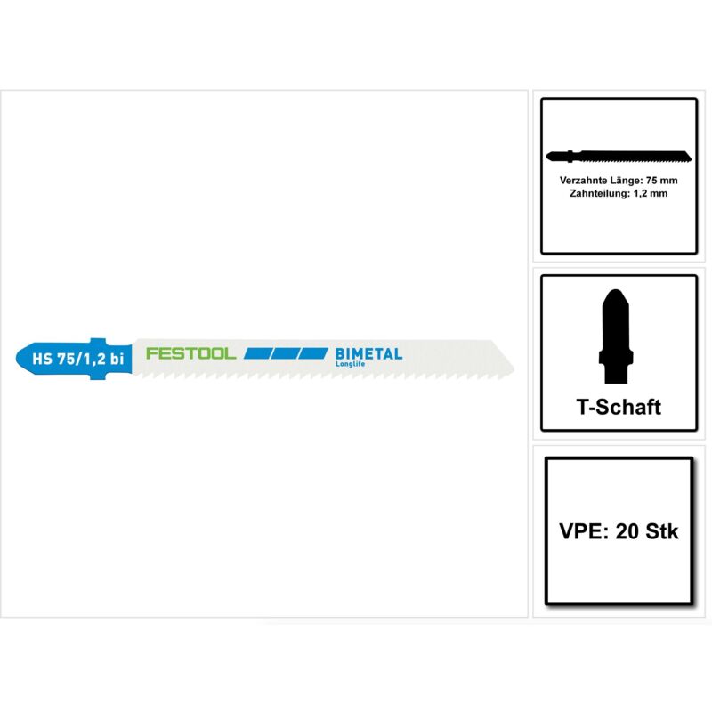 Dotazione: - 20x Festool HS 75/1,2 BI Lama per seghetto alternativo ( 204271 ) Descrizione prodotto: La lama per seghetto alternativo Metal Steel / Stainless Steel è ideale per la lavorazione di alluminio, metalli non ferrosi e acciaio grazie alla sua forma ondulata di base. Il BI-metallo utilizzato (composto da acciaio HCS e HSS) è estremamente durevole e resistente. Con una lunghezza del dente di 75 mm e un passo del dente di 1,2 mm, è possibile lavorare uno spessore massimo del pezzo di 20 mm. Dati tecnici: Lunghezza del dente: 75 mm Passo del dente: 1,2 mm Spessore massimo del pezzo da lavorare: 20 mm Attacco: T-shaft Quantità: 20 unità