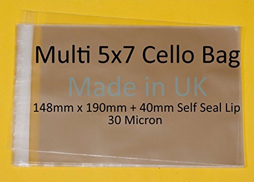 Confezione da 250 sacchetti per violoncello multi 5 x 7 - 30 micron in cellophane trasparente per contenere fino a 10 (5 x 7) biglietti e buste, 148 mm x 190 mm più 30 mm di chiusura automatica