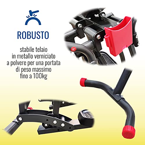✅ CARATTERISTICHE ▶ Colore: Nero ▪ Materiale: Tubi d'acciaio, ABS, PP, EVA ▪ Dimensione: 86 x 46/60 x 130 (h max) cm ▪Pedale: 31 x 12 cm ▪Carico massimo: 100Kg▪ Attenzione: questo air walker non è nella versione luxury, quindi non è fornito anche di elastici.