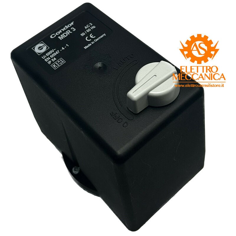 Pressostato Condor MDR 3/11 3x1/4”F+1x3/8”F trifase con protezione termica 10-16A e valvola START codice 1127250050 Potenza massima motore 400 V: 5,5 kW Pressione massima di esercizio: 10 bar Corrente massima: 16 A Ricambio originale FIAC