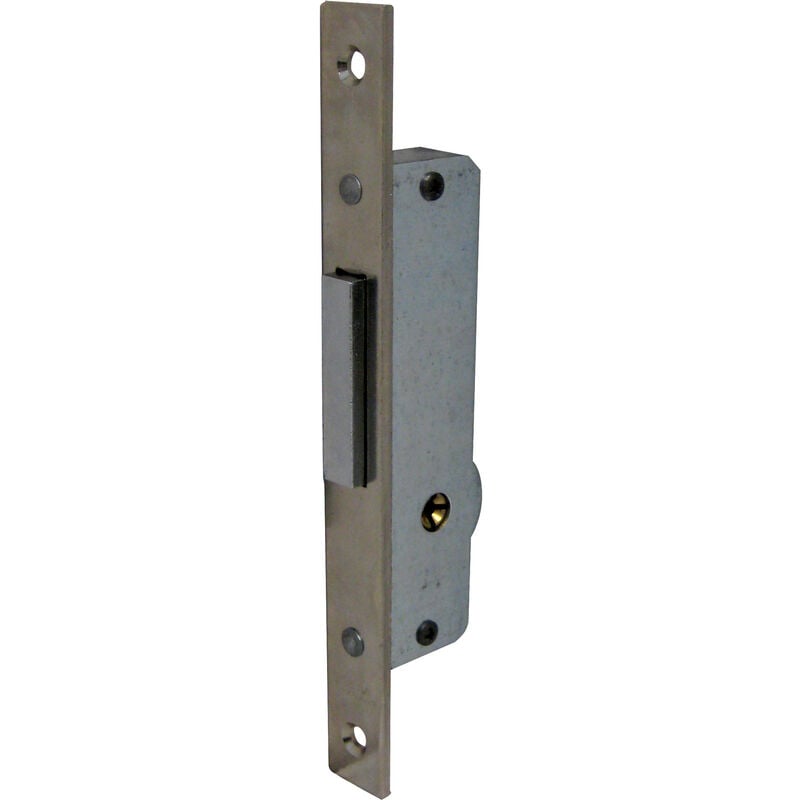 Serratura da infilare. 1 mandata, frontale in acciaio nichelato, 2 chiavi a spillo, scatola mm. 26x100.