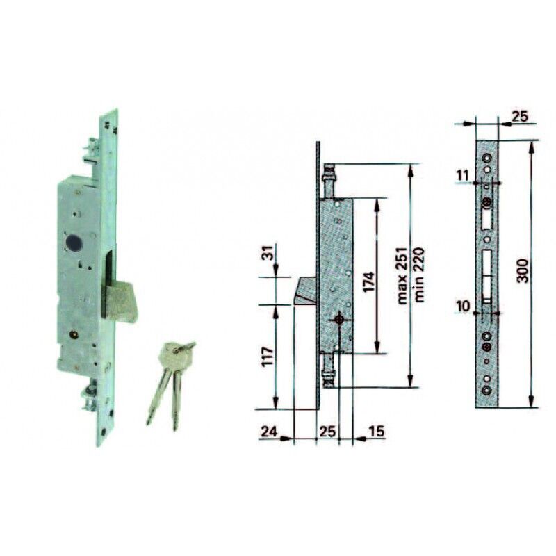 Scatola e frontale mm.25 in acciaio zincato, catenaccio rotante in acciaio nichelato, coppia attacchi per aste filettati 8MA, 2 copritoppa in nylon neri, 1 mandata e cilindro a croce con 2 chiavi