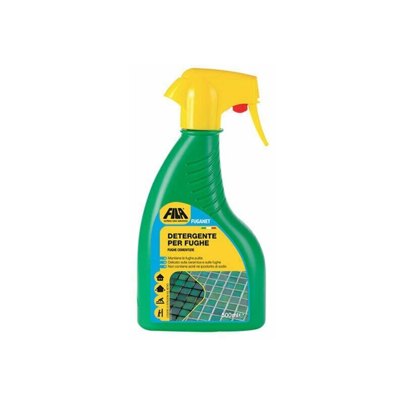 FUGANET DETERGENTE PER FUGHE Detergente per fughe pavimenti in flacone da 500 ml con erogatore a spruzzo (trigger). A cosa serve: Pulisce a fondo le fughe di pavimenti e rivestimenti ceramici: monocottura, bicottura, gres porcellanato con sola esclusione dei tipi assorbenti trattati a cera. Vantaggi: Facile da usare con la praticissima confezione con impugnatura ergonomica e dosatore a spruzzo. Non aggredisce né intacca la piastrella . Non contiene acidi né ipoclorito di sodio. Ideale per: Fughe Cementizie