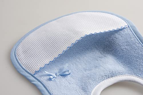 Filet AM720T - Bavaglino Realizzato in Morbido Tessuto Effetto Pois 3D con Portaciuccio e Tasca in Tela Aida da Ricamare, Beige e Bianco & Bavaglino in Morbida Spugna Cinigliata Azzurra, Cielo
