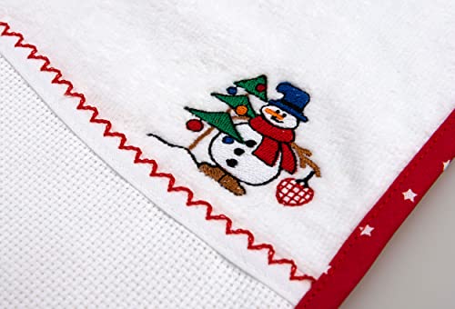 Filet - Bavaglino Neonato Natalizio in Morbida Spugna di Cotone con Tasca in Tela Aida 55Fori da Ricamare, con Ricamo a Forma di Pupazzo di Neve Che Addobba l'Albero, Chiusura Laccetti, Made in Italy