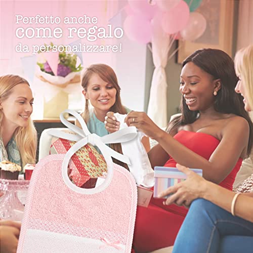 CONTENUTO - A casa riceverete un morbido bavaglino in spugna rosa, realizzato in 100% cotone, con tasca in tela aida da ricamare e chiusura con laccetti. Se sei un amante del ricamo, questo bavaglino fa al caso tuo! Aggiungi il tuo tocco personale ai nostri pronti da ricamare per un pensiero unico e speciale.