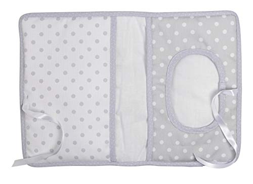 CARATTERISTICHE - Il porta pannolini e salviettine è un pratico accessorio che se aperto, rivela una tasca in cui sistemare alcuni pannolini e le cremine necessarie e un alloggiamento studiato per le salviette umidificate. È realizzato in morbido cotone stampato a cuori, colore grigio, con imbottitura in ovatta di poliestere. Impreziosito nella parte frontale da una tasca in cotone bianco a pois grigio perla e da un ricamo a forma di orsetto con fiocchetto e bottoncini a forma di cuore.
