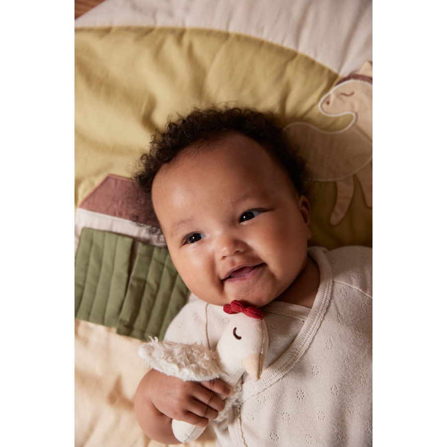 Dettagli del prodotto: Età: da 0 mesi in su Questo simpatico sonaglio con il corpo di una gallina è realizzato in morbido tessuto di lino. L'espressione dolce del viso di Helga la gallina susciterà subito l'interesse del vostro bambino e ha molti dettagli che le manine devono assolutamente esplorare. Tutti i piccoli dettagli sono cuciti sul giocattolo, naturalmente, in modo da non doversi preoccupare delle parti più piccole. All'interno della sua testa, Helga ha un campanello con una dolce suoneria che il vostro bambino amerà sicuramente Le dimensioni ridotte rendono facile per il bambino afferrare e tenere in mano il sonaglio Per rispettare l'ambiente, il sonaglio è riempito con poliestere riciclato Helga la gallina ama aden e può essere facilmente lavata in lavatrice con il programma di lavaggio delicato. Helga è realizzata a mano, il che conferisce a questo simpatico amico un aspetto unico. Dimensioni e peso: Misure una volta assemblato (lunghezza x larghezza x altezza): 15 x 7 x 4,5 cm. Materiale e cura: Materiale: lino, imbottitura in poliestere riciclato. Cura: pulire con un panno umido e un po' di sapone, se necessario. Adatto alla lavatrice con ciclo delicato. Lavare con colori simili