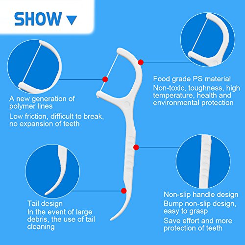 Filo interdentale resistente: i fili sono fatti di Polimero corredato che è più resistente e relativamente scivoloso, piccolo coefficiente di attrito, piccolo danno ai denti. Il filo regge bene e non si spezza. Il filo di seta ultrasottile del filo interdentale di comodità scorre uniformemente fra i denti. Usando materiale HIPS ad alta densità, la nostra impugnatura è più resistente e offre un supporto sufficiente.