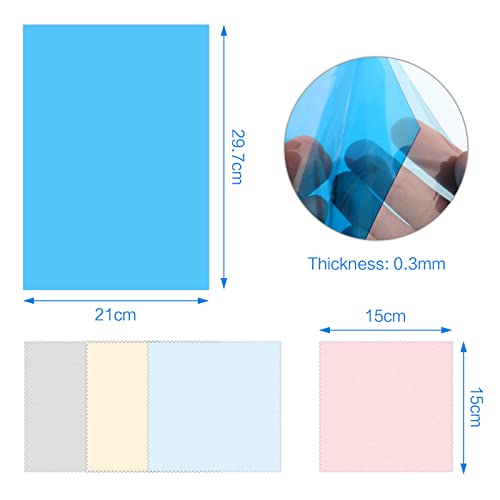 RICEVERAI: Un set di prodotti contenente 11 filtri colori trasparenti e 4 pezza per pulire. Il panno per la pulizia è realizzato in un materiale morbido e ha 4 diversi colori di blu, rosa, beige e grigio. La dimensione del film è 29,7 cm * 21 cm e puoi tagliarlo in qualsiasi forma desideri in base alle tue esigenze.