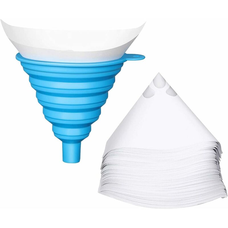 Materiale: i filtri del filtro della vernice sono realizzati in carta di qualità con punta in rete di nylon nella parte inferiore, resistente e non facile da rompere, garantendo un uso a lungo termine. Funzione utile: questi coni i filtri per vernice possono prevenire l'intasamento dell'attrezzatura di verniciatura, possono filtrare la vernice dallo spruzzatore prima di riempirlo di liquido per evitare l'intasamento. Imbuto in silicone: La confezione viene fornita con un imbuto in silicone pieghevole, che può essere facilmente ripiegato o lasciato cadere nel contenitore da un litro, senza più preoccupazioni per il collasso del cono. I filtri per vernice a forma di cono sono adatti per la maggior parte dei tipi di pitture, resine, vernici, lacche e coloranti. Il filtro in silicone flessibile è facile da piegare. L'imbuto del filtro colorato ha un piccolo foro nell'imbuto ed è progettato per essere appeso al muro. Imbuto pieghevole in silicone blu, facile da pulire, basta aggiungere un