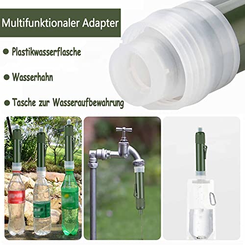Facile da usare: il mini filtro dell'acqua portatile per esterni è dotato di un adattatore in silicone multifunzionale che può essere collegato a bottiglie di acqua minerale, sacchetti di immagazzinamento dell'acqua, rubinetti, ecc. Con la cannuccia di prolunga in dotazione è possibile bere anche direttamente dalla fonte d'acqua.