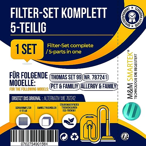 Set filtro completo (5 pezzi) per Pet & Family, Allergy & Family, Multi Clean X8 Parquet, Multi Clean X10 Parq, X7, Thomas Aqua+ aspirapolvere alternativo come Thomas Set Filtri 99 (numero 787241)