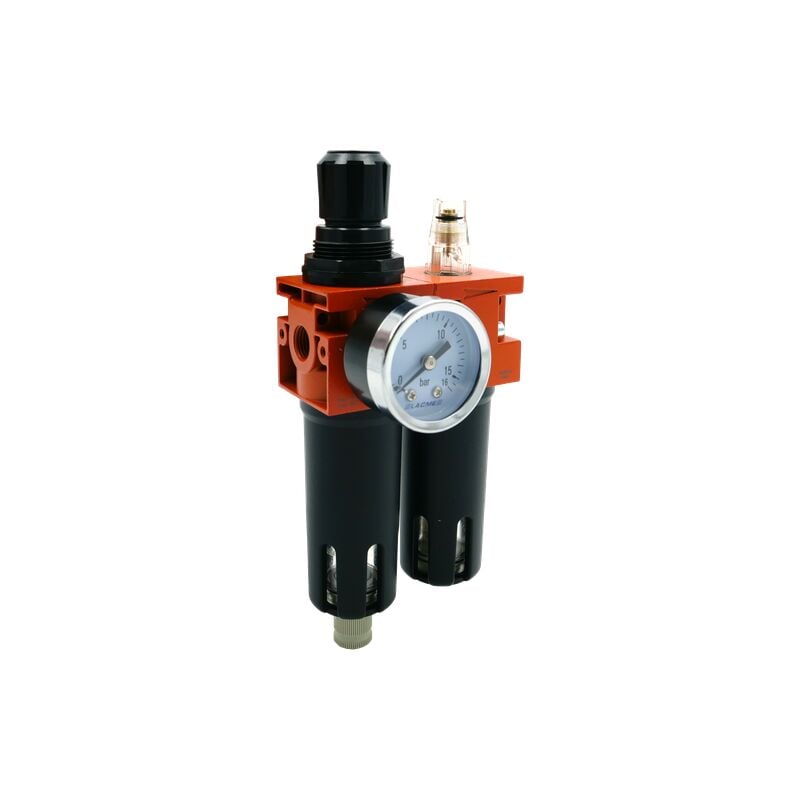 Dettagli: Robusta apparecchiatura per il trattamento dell'aria: corpo in metallo. Permette di filtrare e/o lubrificare l'aria in uscita da un compressore all'ingresso di un impianto o di un'apparecchiatura ad aria compressa. Design robusto. Facile regolazione. Vista a 360°