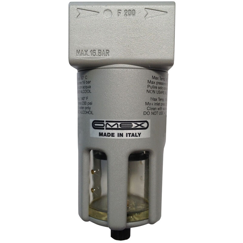 Filtro con scarico rapido Staffa di fissaggio a parete inclusa nella confezione e nel prezzo Art. 195/5 Size: 3/8 Normale Pressione max d'entrata: 16 bar Portata a 6 bar: 6000 Nl/min Capacita tazza: 50 ml Filtraggio: 10 micron