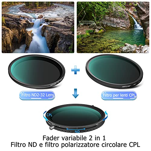 Filtro ND variabile ARTCISE 62 mm + filtro polarizzatore polarizzatore CPL 2 in 1, filtro ND graduato regolabile ND2-ND32, NO "X" Corss, filtro lente con rivestimento Muiti con coperchio del filtro