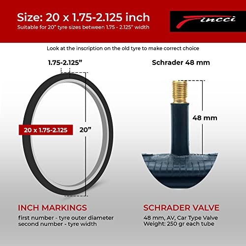 Fincci 20 x 1,75 1,95 2,0 2,1 2,125 Pollici 48mm Schrader Valvola Interna Camera d'Aria per BMX MTB Montagna Fuori Strada o Bambini Bici Bicicletta