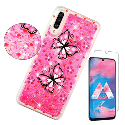 Finemoco Cover per Samsung Galaxy A50 Custodia Silicone Trasparente Morbida Sottile Protezione Cover Glitter 3D Rosa Liquido Antiurto Gomma TPU Bumper Case + Vetro Temperato Pellicola,Farfalla