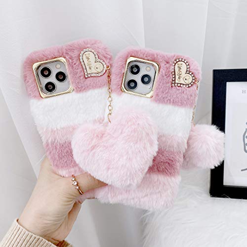 Finemoco Peluche Cover per Samsung Galaxy A31 Custodia Morbida Silicone Protettiva Cover Carina Peloso Amore-Cuore Caldo Cover Caso Artificiale Pelliccia Brillante Strass Flessibile Case,Rosa Bianco