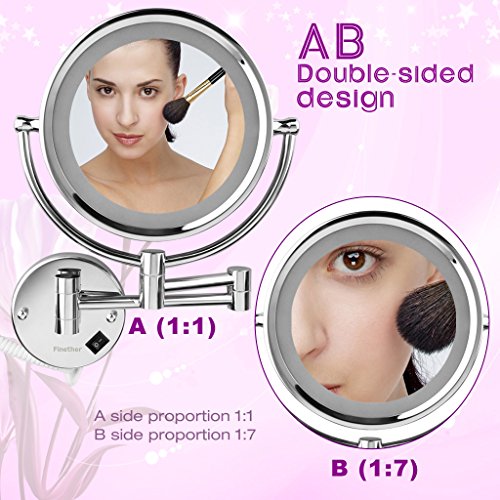 Finether 8.5" Specchio da Trucco/da Barba con Luce LED, Specchio Cosmetico Illuminato Ingradimento 7X, Ruota di 360°, con Braccio Pieghevole, Montaggio da Parete, Specchio Doppia Faccia
