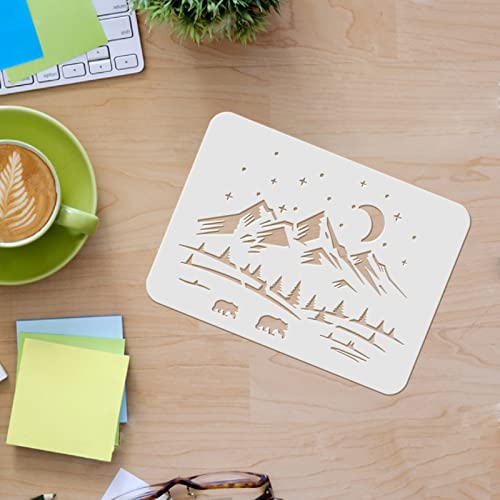 Stencil in plastica progettato da cucciolo di orso, montagne innevate, pini, che aggiungono sorprese e felici alla tua vita. Dimensioni: circa 29,7 x 21 cm.