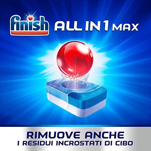 Finish All in 1 Max è un detersivo lavastoviglie in pastiglie con azione sgrassante e pretrattante, che rimuove facilmente le incrostazioni di cibo ardue, come uovo e sugo