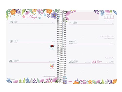 Interni: Settimana Vista Orizzontale. Visione settimanale completa in horitontal che consente la scrittura naturale. Con pianificazione mensile a scacchi all'inizio di ogni mese. Lingua dell'articolo: spagnolo. Con indicazione sulla rendita delle festività spagnole.