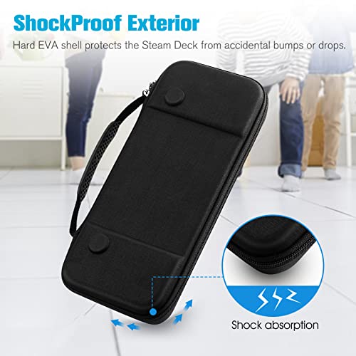 Il guscio rigido in EVA protegge lo Steam Deck/Steam Deck OLED da urti accidentali, cadute e graffi. L'interno morbido protegge lo Steam Deck dall'usura quotidiana.