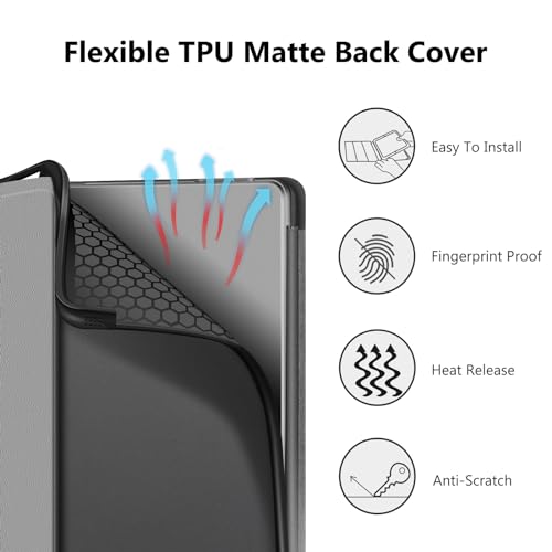 La resistente copertura in similpelle e l'interno rivestito in gomma antiscivolo offrono una protezione completa per il tuo tablet. Il morbido guscio posteriore in TPU flessibile protegge il tuo dispositivo da urti, cadute e impatti.
