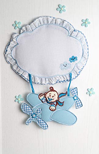 Fiocco nascita bimbo bimba da ricamare con inserto in tela aida a puntocroce (aereoplano azzurro)