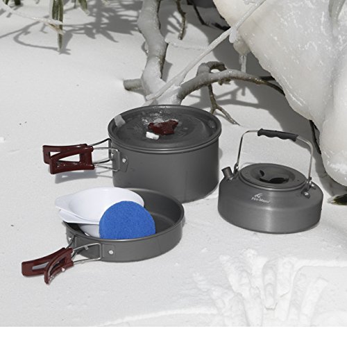 Questo kit di pentole e' composto da una pentola(diametro170xaltezza100mm), una padella(177x37mm), una teiera(153x67mm), una spatola, una ciotola, una spugnetta, e' una scelta perfetta per un piccolo gruppo(2-3 persone) per il campeggio.