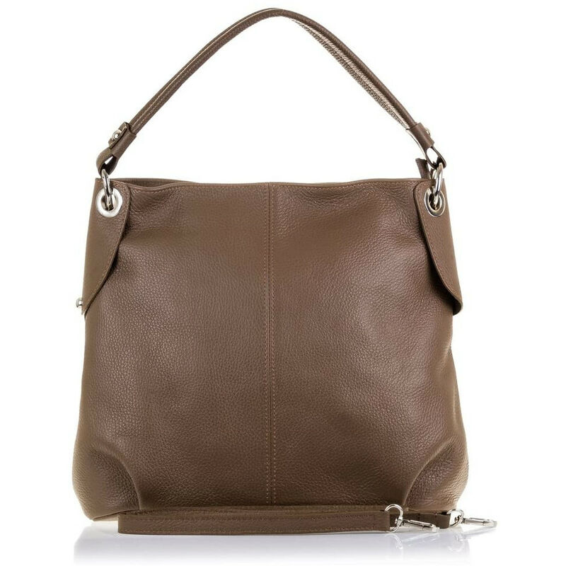 Borsa in pelle finitura Dollaro Scomparto principale e tasca posteriore con chiusura a zip. Interno foderato in tessuto con due scomparti separati da cerniera, tasca ausiliare laterale con la stessa chiusura e due scomparti aperti. Dispone di un manico flessibile con dettagli metallici decorativi vera pelle italiana