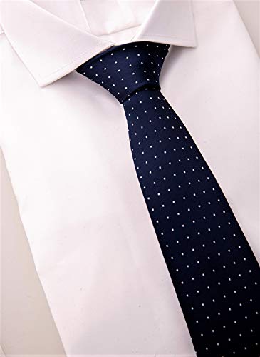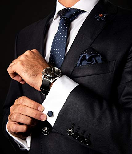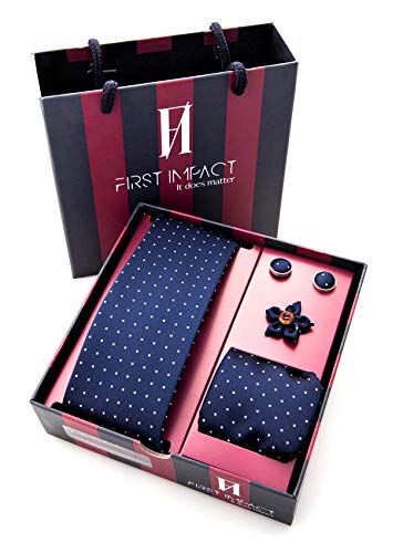 First Impact - Cravatta uomo + Gemelli camicia uomo + Pochette uomo + Spilla Giacca uomo (Set cravatta uomo 4 pz) Confezione regalo uomo, Idea regalo uomo (Blu pois bianchi)