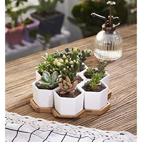 First Park, Piccoli vasetti in Ceramica per Fiori, Piante grasse e Cacti, Bianchi, di Forma Esagonale, con Vassoio in bambù