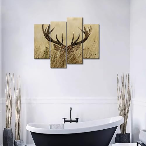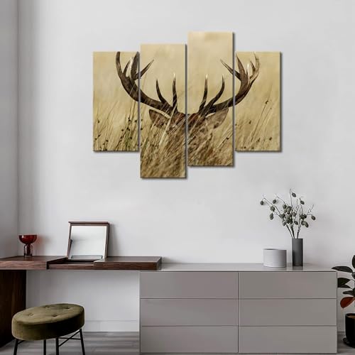 First Wall Art - Cervo Quadri Cervo con Lunghe Corna tra i Cespugli Stampa su Tela 4 Pannelli Moderni Animali Decorazione da Parete per Soggiorno,Camera da Letto,Cucina
