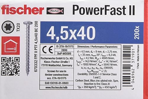 Contenuto della confezione: 200 viti per truciolato Power-Fast II 4,5 x 40, testa Pan Head con stella interna TX filettatura completa zinca