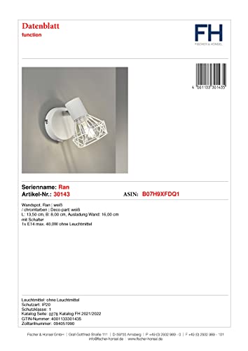 Fischer & Honsel 30143 - Faretto da parete, 1 x E14, max. 40 W, bianco/cromato, con interruttore, 13,5 x 8 x 16 cm, 1 faretto