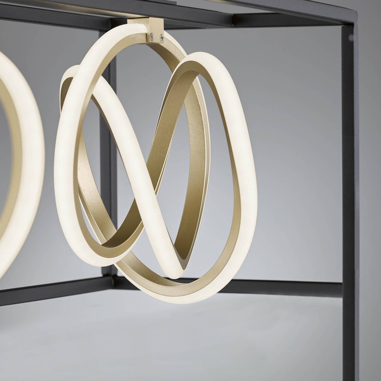 Lampada a sospensione LED dimmerabile Gisi con colore della luce regolabileDotata di telecomando e di un aspetto molto individuale, la lampada a sospensione Gisi convince su tutta la linea. Una cornice angolare e sottile in metallo nero circonda le quattro sorgenti luminose, che hanno la forma di spirali. I loro percorsi curvilinei sono colorati d'oro. La luce dei LED viene emessa in modo omogeneo in tutte le direzioni attraverso i paralumi in plastica bianca. Con l'aiuto del telecomando, la luminosità può essere regolata in modo continuo, per adattarsi in modo ottimale alle condizioni di luce. Inoltre, Gisi ha la possibilità di controllare la luce bianca. Tramite il telecomando è possibile realizzare diversi colori di luce, dal bianco caldo alla luce diurna.