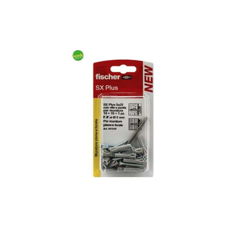Tasselli + Vite + Punta SX Plus prodotti dal brand Fischer. Il tasselloin nylon fischer SX Plus, grazie all'espansione a 4 settori, trasferisce le forze in modo ottimale nel supporto, assicurando una tenuta perfetta nei materiali da costruzione pieni e carichi elevati su tutte le murature. L'innovativo design del tassello garantisce un feeling di installazione perfetto, con una coppia di serraggio sempre sotto controllo. SX Plus è il fissaggio leggero ideale per artigiani e professionisti, ma facile e rapido da utilizzare anche per utenti hobbisty.