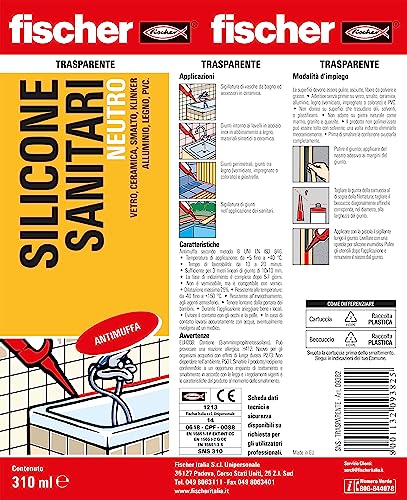 Fischer Silicone Sigillante Sanitari SNS Trasparente, Neutro, Antimuffa, per Ambienti Sanitari, Vasca, Doccia, Lavabo, Senza Solventi, Inodore, Uso Esterno / Interno, 9382