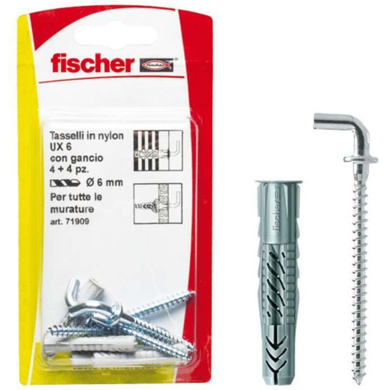 Dalla linea di articoli dedicati ai fissaggi e ancoraggi a marchio FISCHER, il kit di tasselli UX 6 X 35 H K e ganci dritti in acciaio, è composto dai tasselli in nylon, dal Ø di 6 mm, sono caratterizzati dal principio di funzionamento universale, che avviene per annodamento ed espansione, e ne permette il suo utilizzo in tutti i materiali di supporto pieni, forati e in lastre. Il fissaggio UX è la scelta giusta se non si conosce il materiale di base, infatti grazie alle alette laterali dell'UX assicurano una guidaottimale della vite. Le alette seghettate anti-rotazione impediscono la rotazione nel foro del tassello, questo garantisce la massima sicurezza durante l'installazione. I tasselli UX fischer sono la scelta migliore per fissare qualsiasi cosa, su superfici come calcestruzzo, mattone pieno, blocchi cavi, pietra naturale.