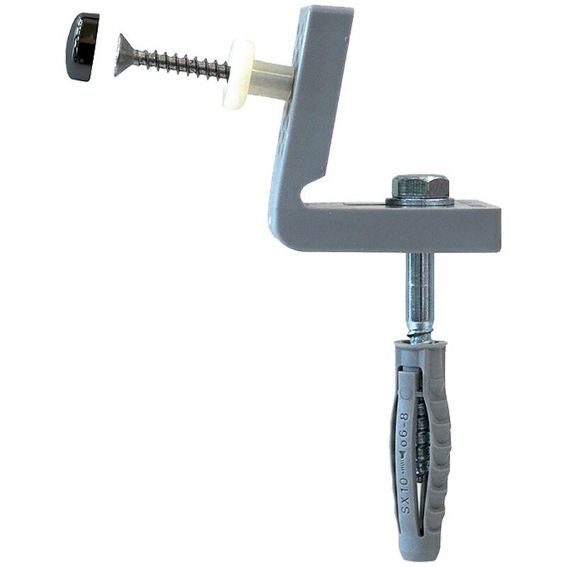 Con staffa forata in nylon, vite mordente te zincata, rosetta ø 8 mm, vite truciolare inox a2 aisi 304 taglio a croce, boccola nylon, calotta coprivite cromata. in busta da 2 pezzi.ø 10 x 60 - m7 x 65 mm